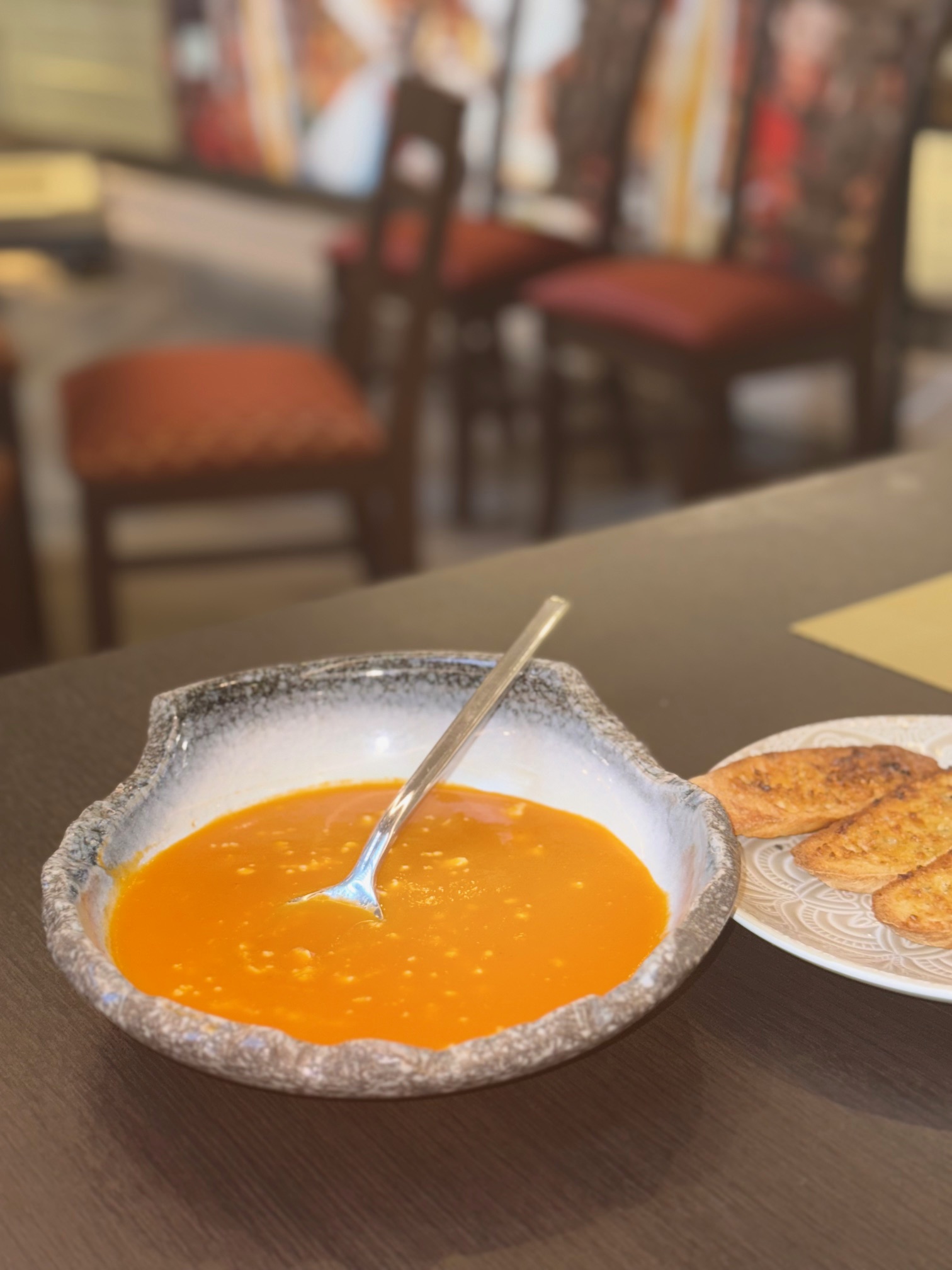 Crema de tomate con toques de queso fetta y pan de la casa.